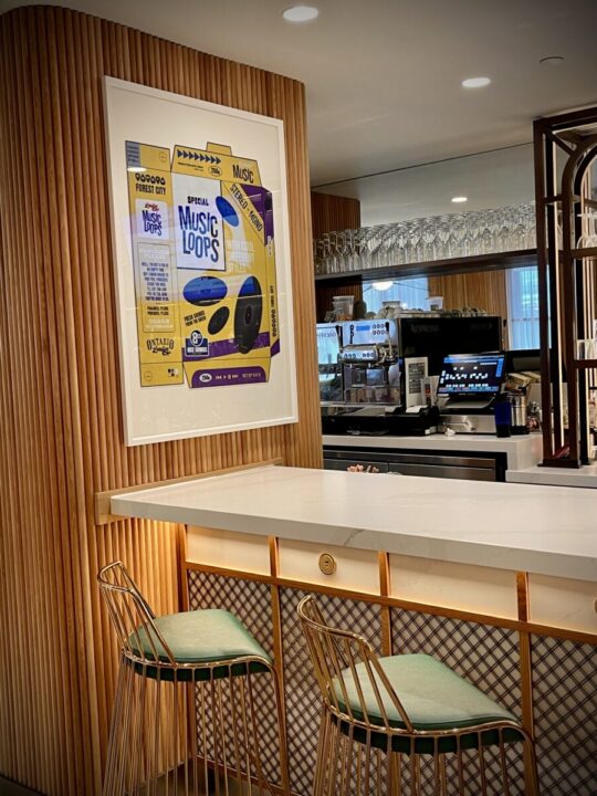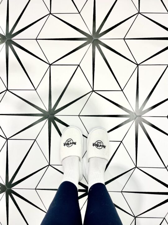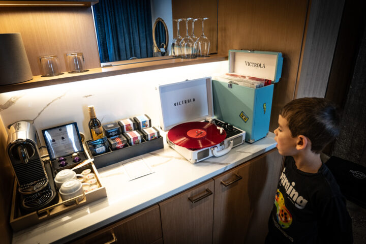 Há opções de quartos familiares espaçosos, pensados para quem viaja com crianças e precisa de conforto sem abrir mão do estilo. A decoração segue a identidade icônica do Hard Rock, com elementos modernos, detalhes inspirados na música e uma atmosfera sofisticada, mas ao mesmo tempo acolhedora. Uma das coisas que mais me surpreendeu é como o hotel consegue unir luxo e praticidade para quem viaja com crianças. O quarto que ficamos era super espaçoso e tinha um espaço com beliche e TV para os pequenos. Tinha uma vitrola com discos de vinil para tocar e também no espelho nomes de artistas e suas alturas. E vários detalhes do quarto – incluindo colunas e o chão – originais da época da fábrica.