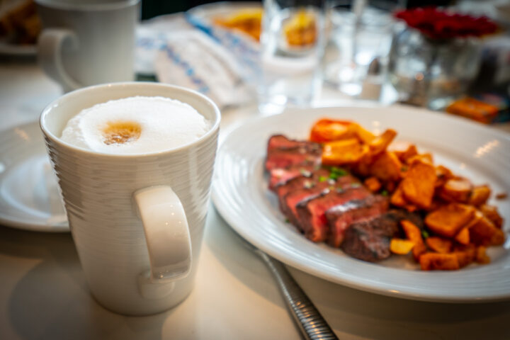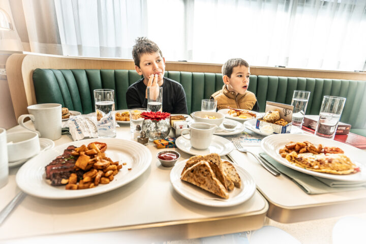 Outro ponto alto da experiência é a variedade gastronômica dentro do próprio hotel e do complexo (clique aqui para ver todos os restaurantes). Nós tomamos café no Sessions Restaurant, que é perfeito para café da manhã ou brunch em família. Alguns itens do menu fazem referência à história da fábrica de cereais, criando uma experiência divertida e temática. No lobby também fica o GMT-5 Lobby Bar, com chá da tarde, snacks doces e salgados e, muitas vezes, música ao vivo. E por fim, o 1913 Restaurant, inspirado no ano de fundação da antiga fábrica Kellogg, o restaurante tem uma atmosfera intimista, quase estilo speakeasy. O menu com influência mediterrânea traz pratos sofisticados e coquetéis artesanais preparados na casa.