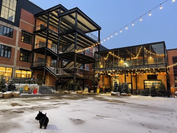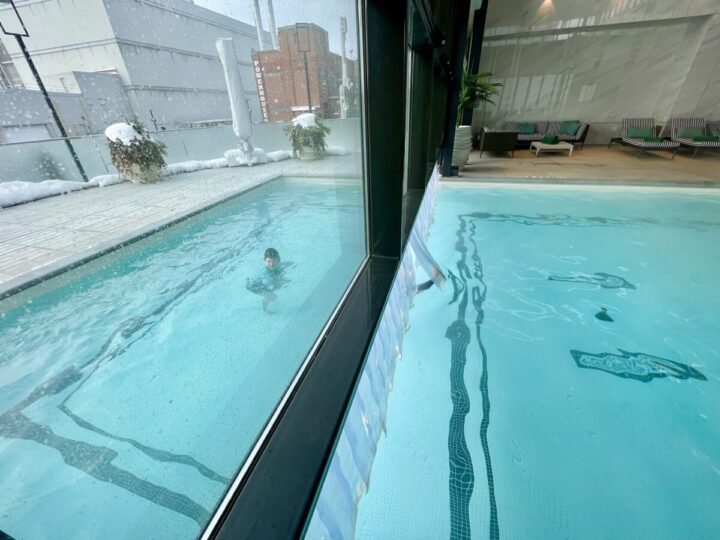 As áreas comuns também são um grande destaque – especialmente a piscina aquecida indoor/outdoor, perfeita para relaxar em qualquer estação do ano. Claro que fomos curtir a piscina – e olha que a temperatura estava -26C no dia que visitamos o hotel: a sensação de sair da água quente e ver o ambiente externo é simplesmente incrível. E achei o máximo que a piscina fica aberta até 10pm para famílias e até meia-noite para adultos. Ah, e vale falar que o hotel é pet-friendly e a Ella foi super mimada com uma cama super confortável, treats e outros mimos.